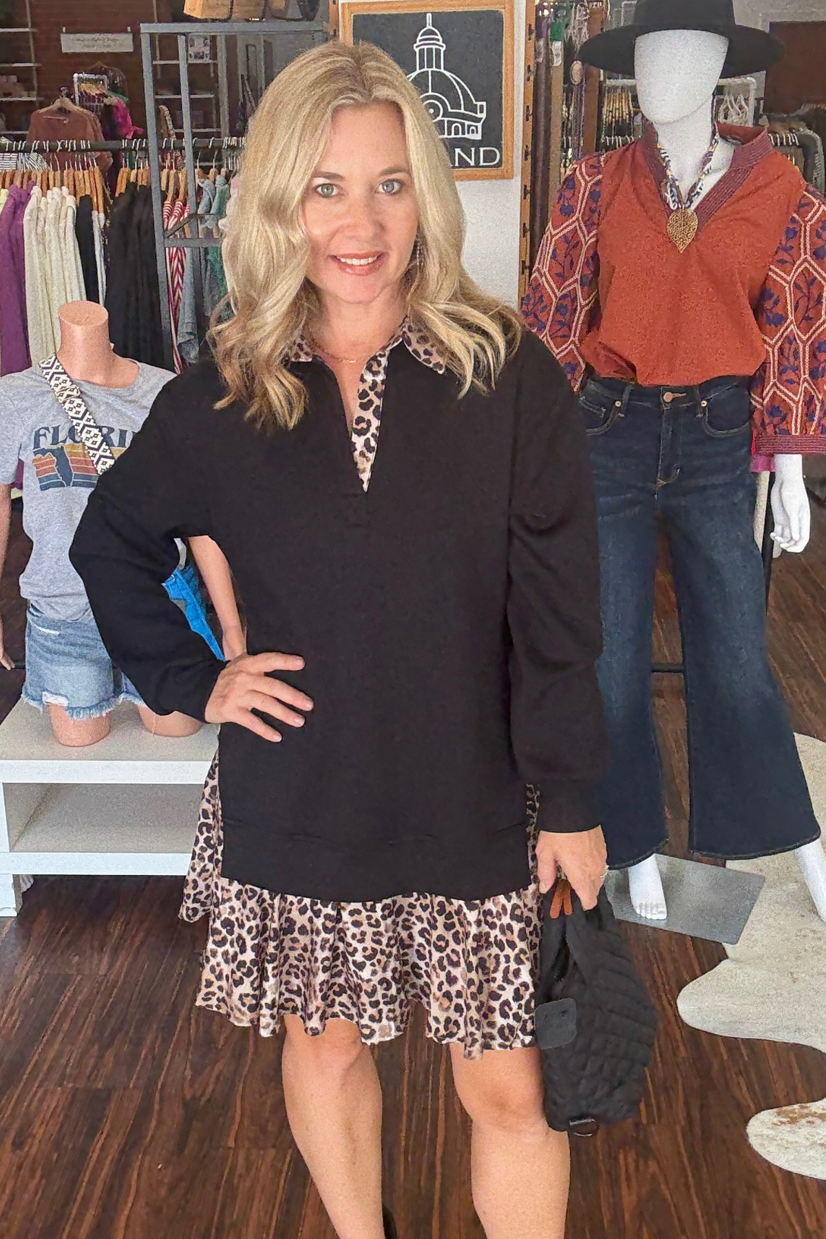 This modern pullover mini dress features a long sleeve spread collar and a striking animal print contrast accent at the skirt. Crafted from lightweight woven fabric and fully lined, it offers comfort without being sheer. Practical side pockets complete the look, blending style with functionality for an effortlessly chic outfit. Model is wearing size small.
