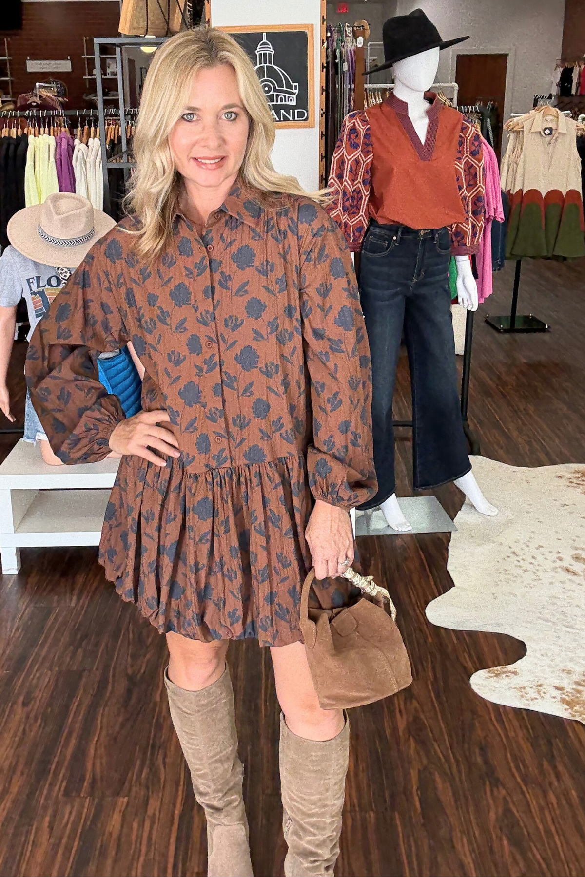 This long sleeve mini dress features a navy floral print on a warm brown background, combining classic and contemporary styles. The drop waist and button-down front create a flattering silhouette, while the bubble hem adds a playful, modern touch. Perfect for transitioning from day to night with effortless style. Model is wearing size small.