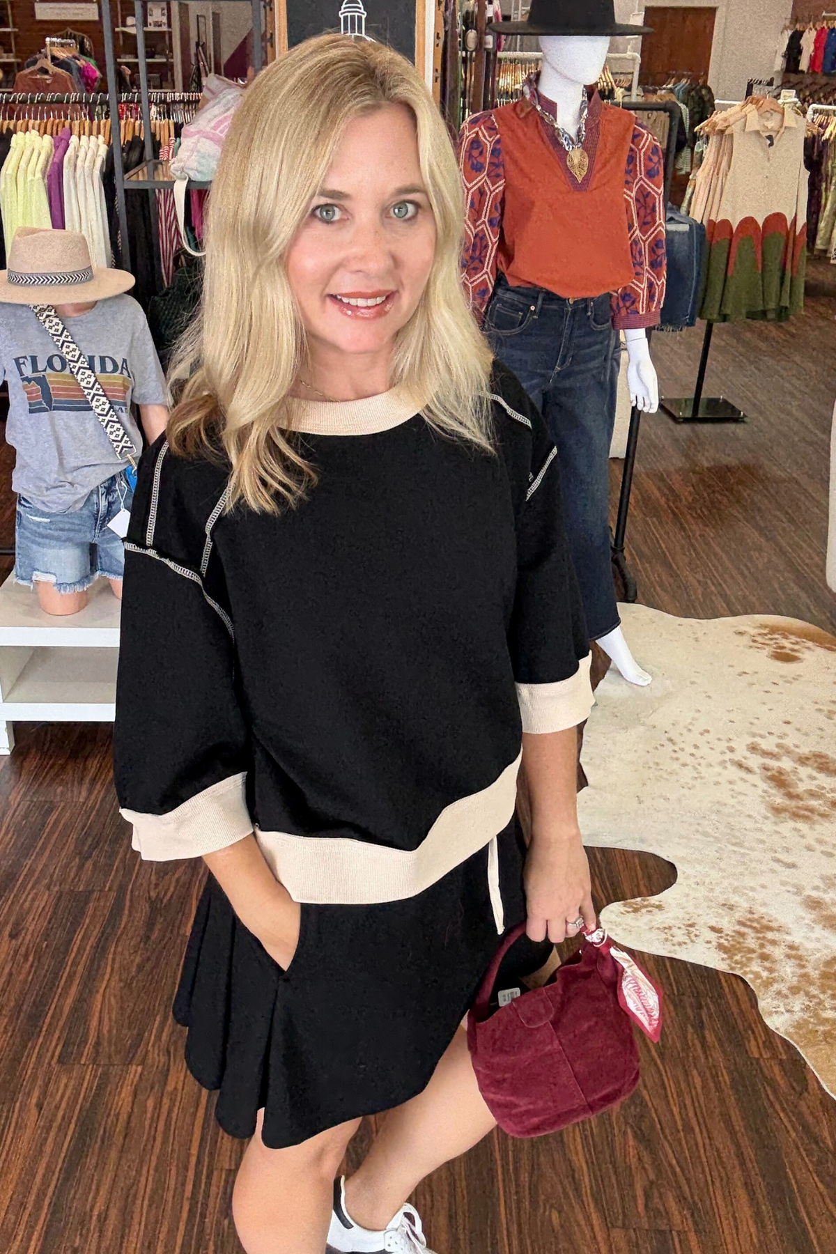 This modern set pairs a solid knit waist-length pullover with a contrast accent band for a sleek finish. The pullover is lightweight, non-sheer, and unlined for comfortable wear. The matching skort features an adjustable elastic waistband, pleated detail at the back, and convenient side pockets, all lined for added comfort. Both pieces offer a breezy, stylish look ideal for everyday wear. Model is wearing size small.