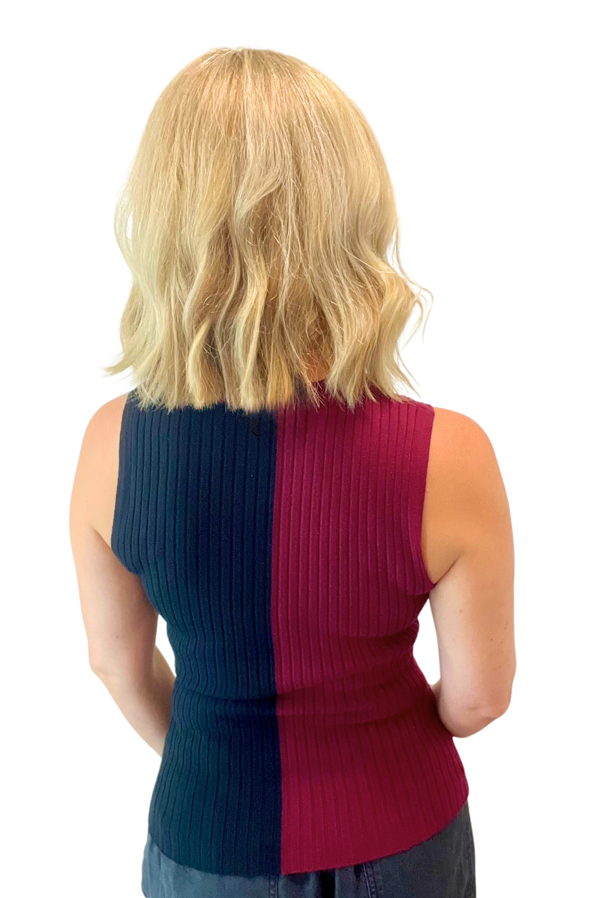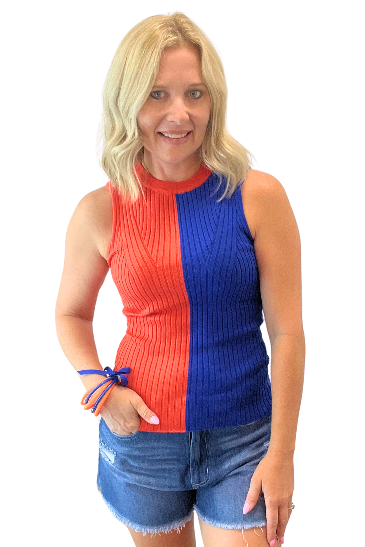 Elevate your wardrobe with our chic Colorblock Tank Top. This sleeveless rib knit sweater top features a trendy split color design and a flattering round neck. Perfect for game days or everyday wear, this top will keep you looking stylish and on-trend.