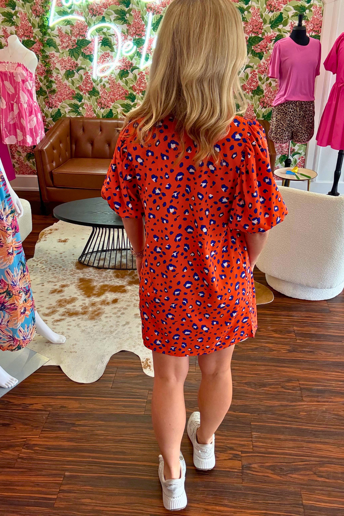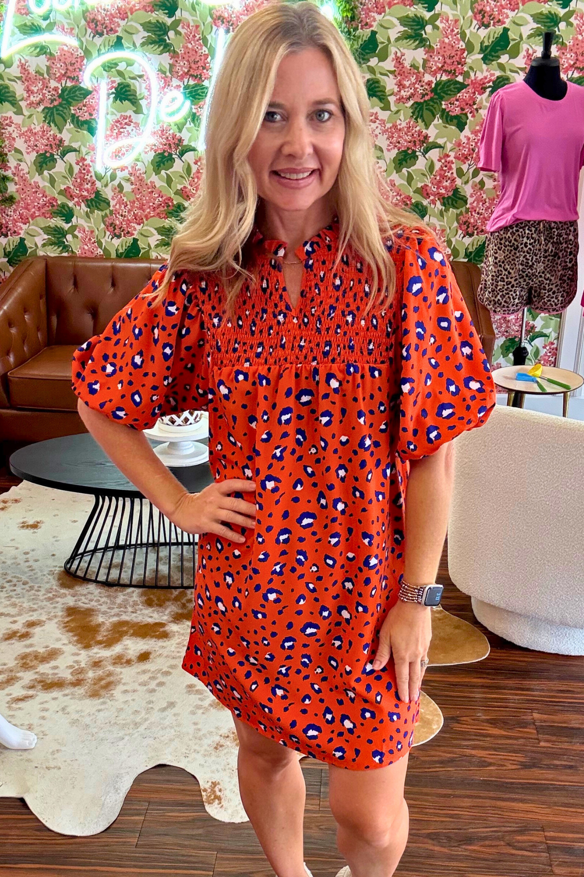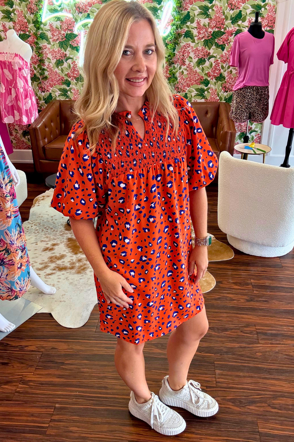 This Orange and Blue Animal Print Dress features a modern shift silhouette with a smocked V-neck and comfortable 3/4 sleeves finished with elastic cuffs. Its vibrant print and relaxed fit make it a stylish choice for effortless everyday wear. Model is wearing size XS.