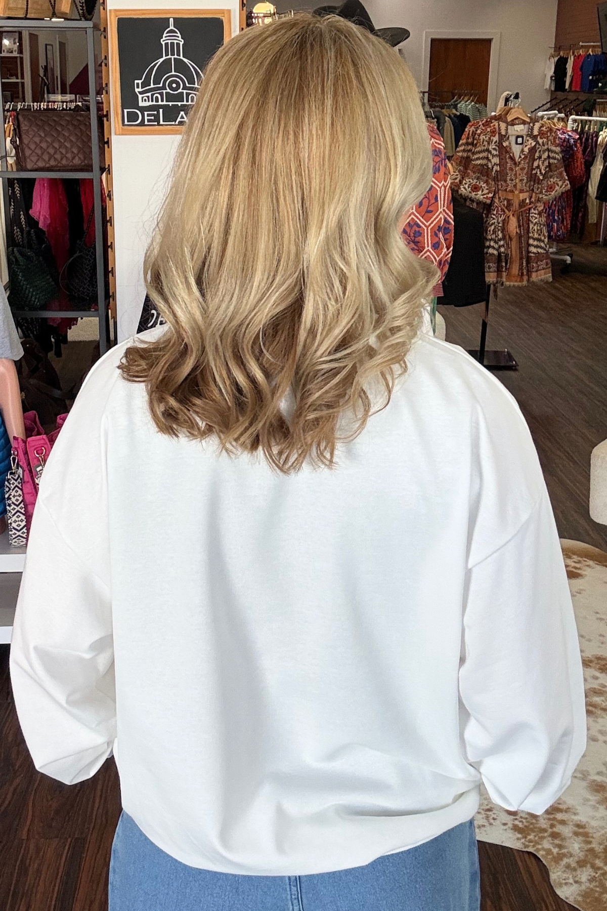 This white sweatshirt features a vibrant patchwork design spelling out "Holly Jolly" across the front, adding a festive and contemporary touch to your holiday wardrobe. Crafted for comfort and style, it pairs effortlessly with casual outfits while spreading cheerful seasonal vibes. Model is wearing size small.