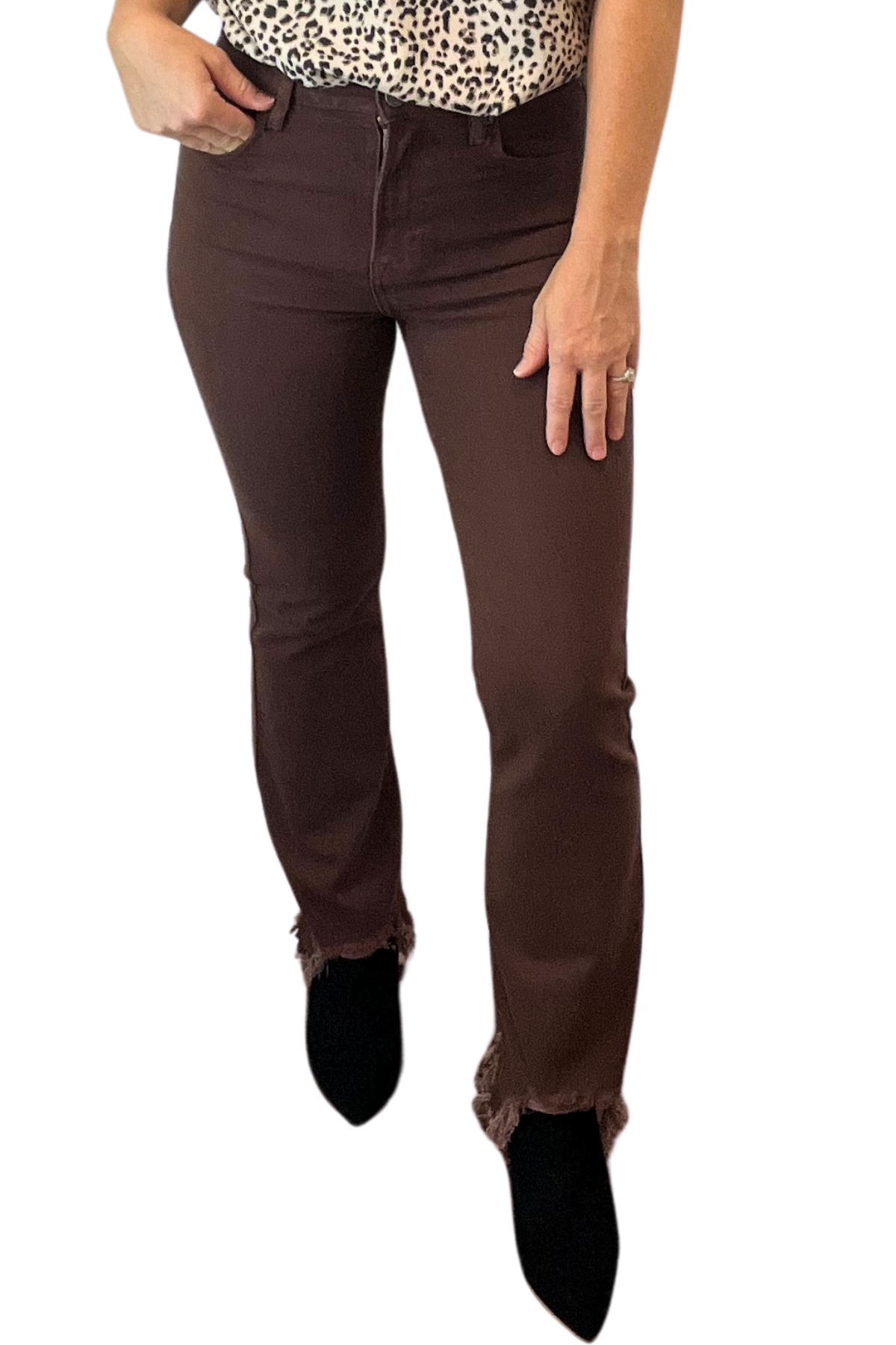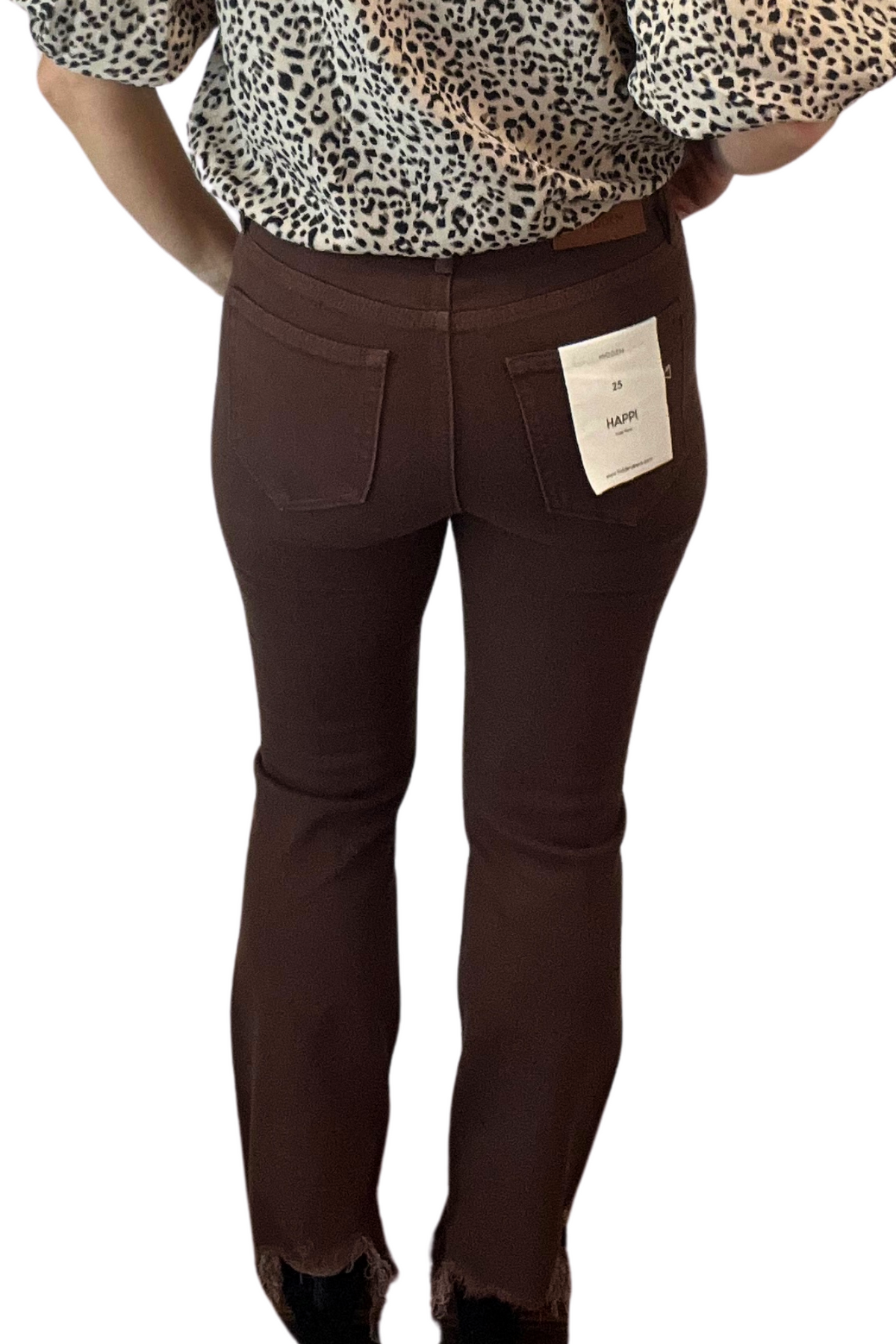 These Hidden Chocolate Happi Cropped Flares feature amazing stretch, stylish frayed hem and a flattering cropped flare design. Perfect for adding a touch of edge to your fall wardrobe. Model is a size 2 and wearing size 25.
