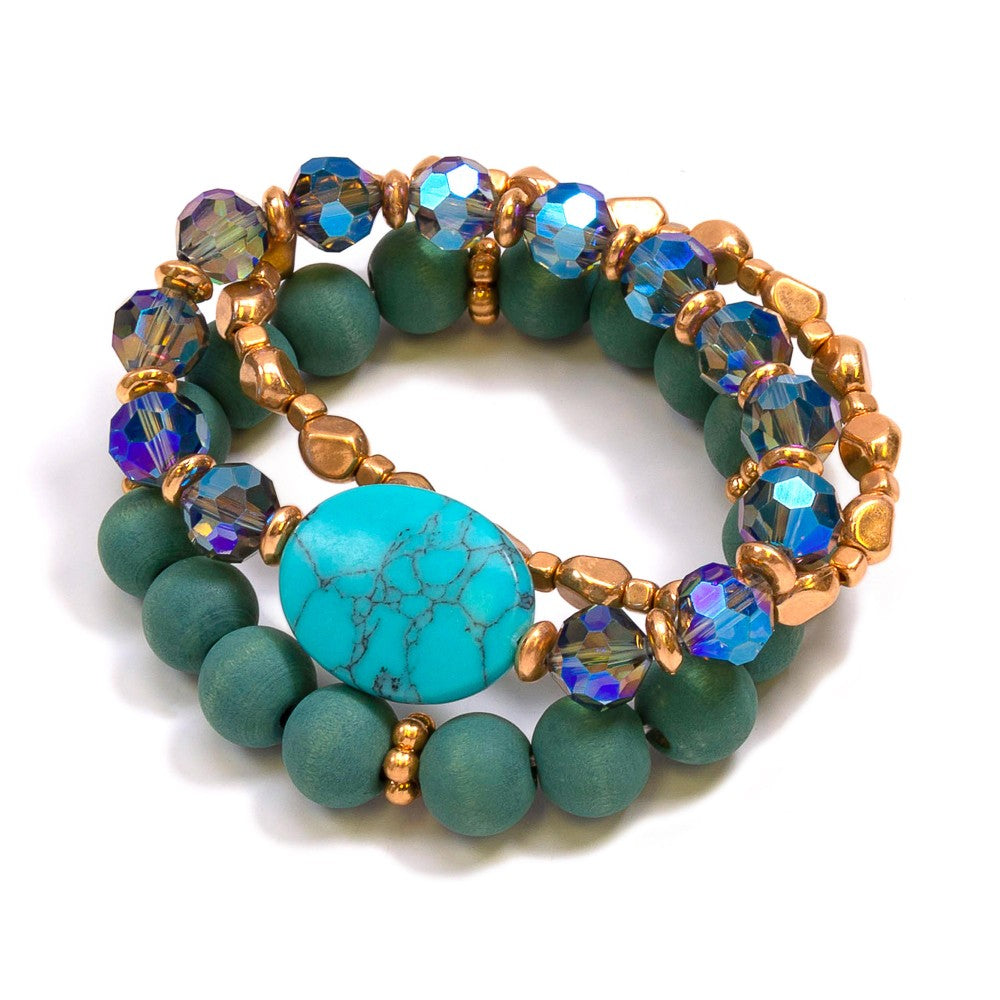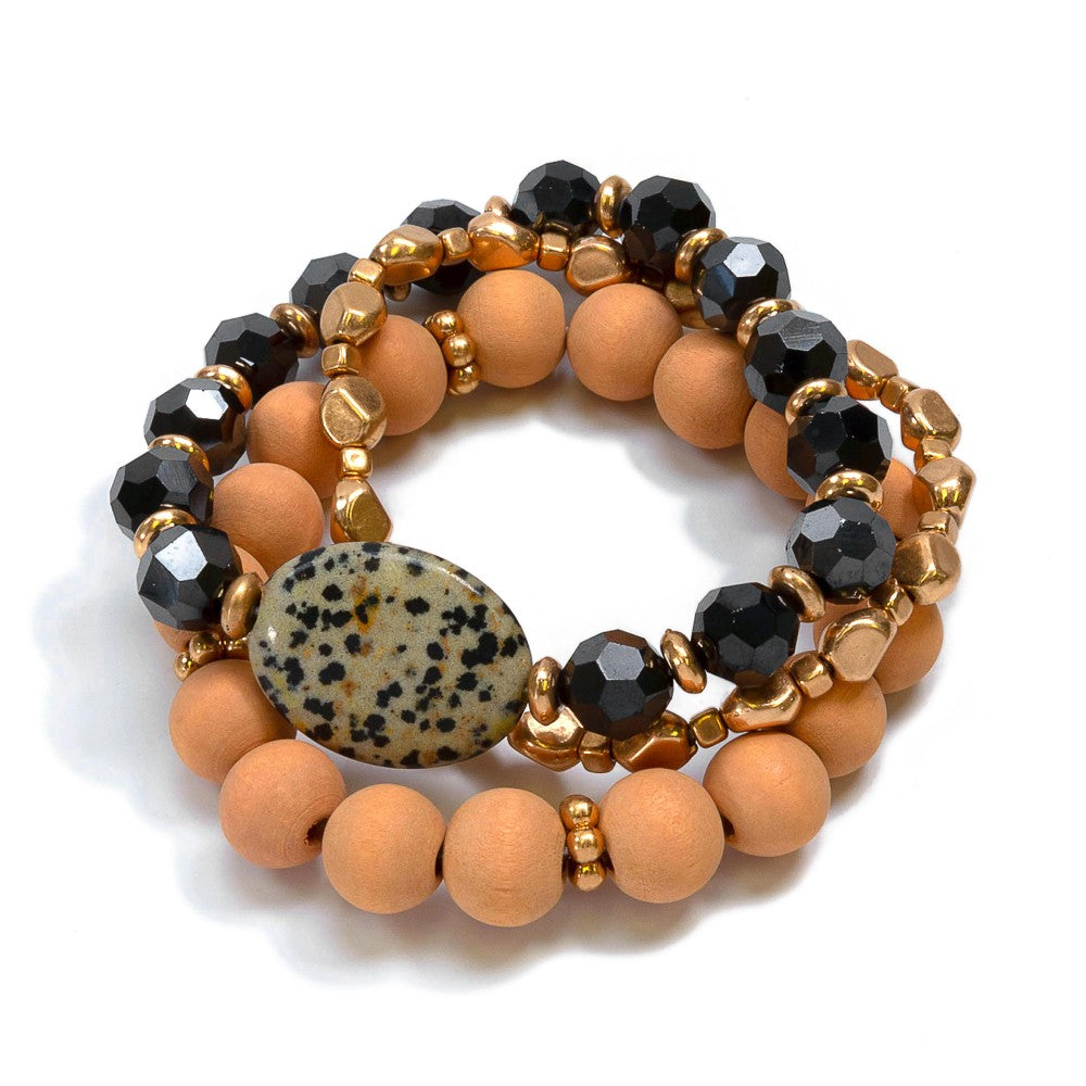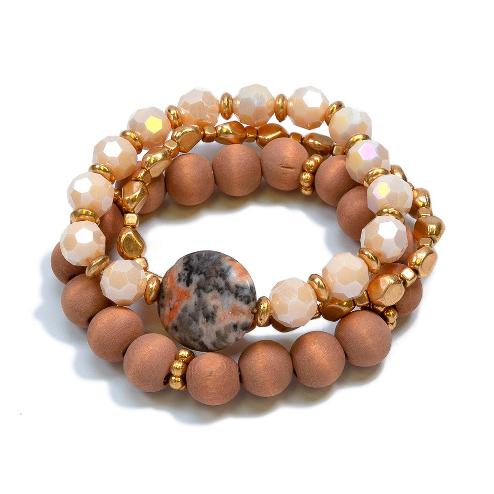 Set of Three Beaded Stretch Bracelets Featuring Wooden Beads and Semi Precious Focal