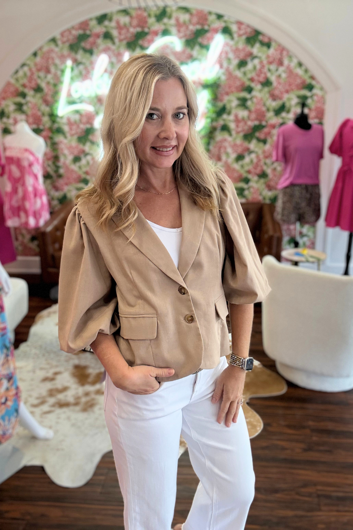 The Bubble Half Sleeve Blazer features trendy bubble sleeves that stop just above the elbow, creating a fresh and stylish silhouette. Its sleek button-front design adds a modern edge, perfect for elevating any outfit with a contemporary twist. Model is wearing size small. 70% Viscose, 30% Linen.