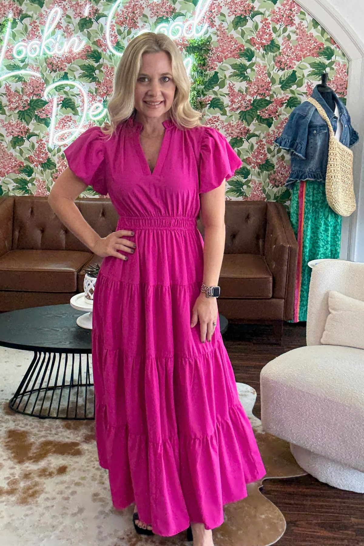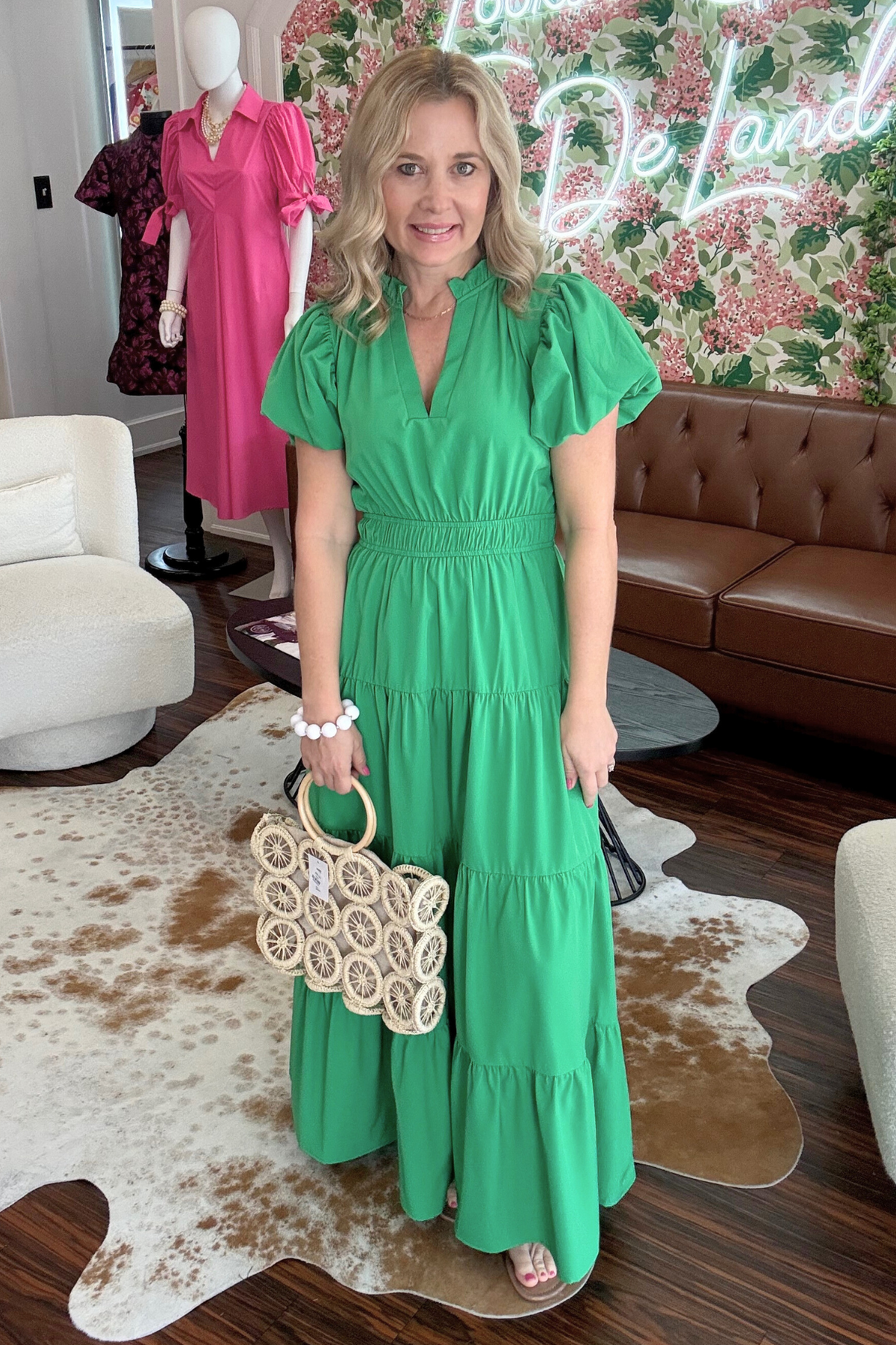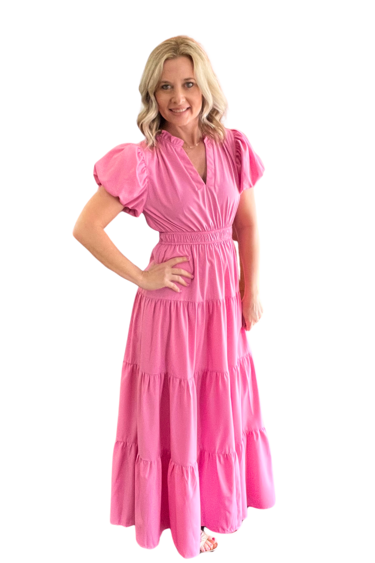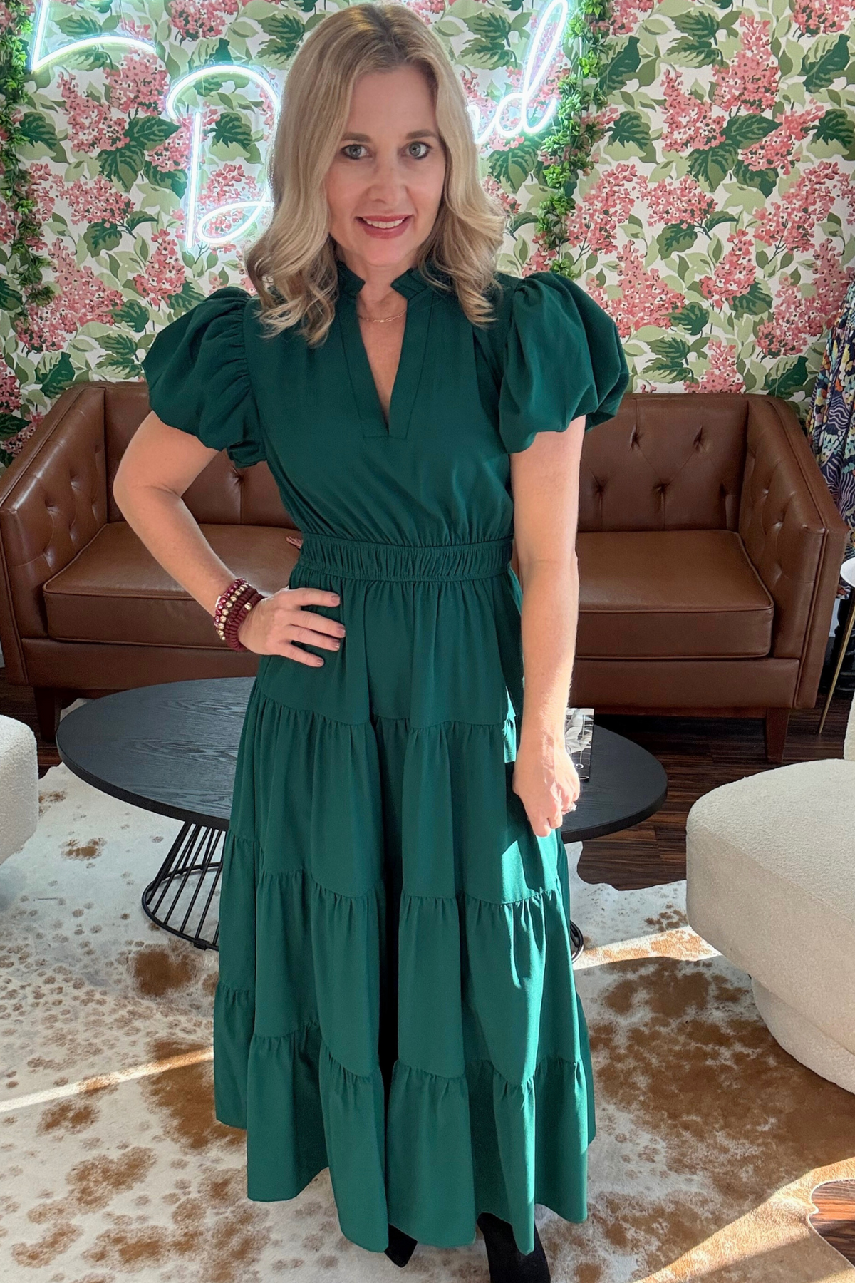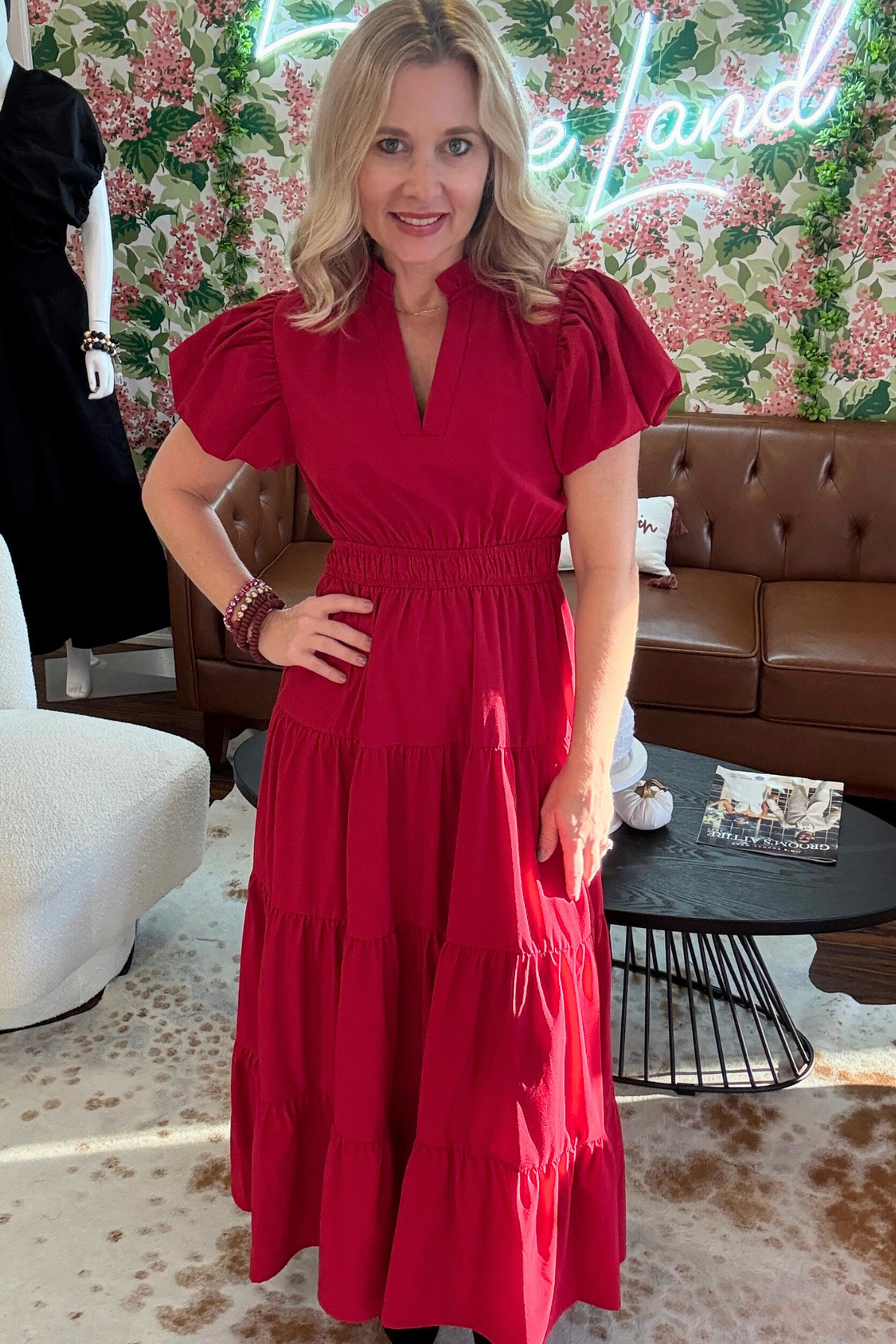 This Bubble Sleeve V-Neck Midi Dress is stunning and perfect for your next fall event. Featuring a V-neck and bubble sleeves, this tiered midi dress is lightweight and non-sheer, with an elastic waistband for added comfort. A ruffle neckline detail completes the classic look. 52 inches from shoulder to hem. Model is 5'4" and wearing size small.