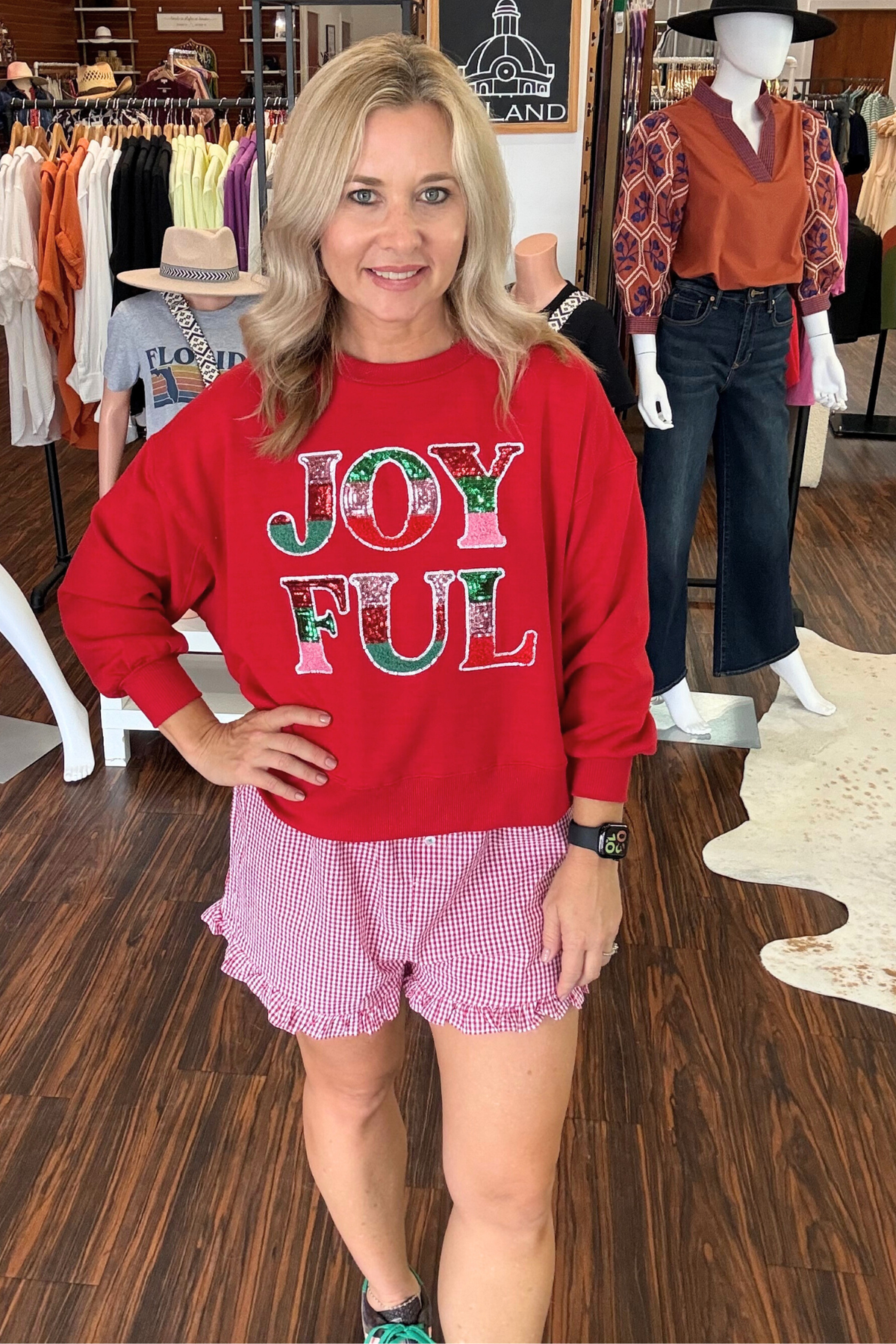 These gingham shorts combine classic red and white print with a playful ruffle hem for a fresh, modern look. The elastic waist ensures comfort and a perfect fit, while the bold "Cheers" chenille lettering across the back adds a fun, casual vibe. Perfect to pair with your favorite holiday sweatshirt or tee. Model is wearing size small.