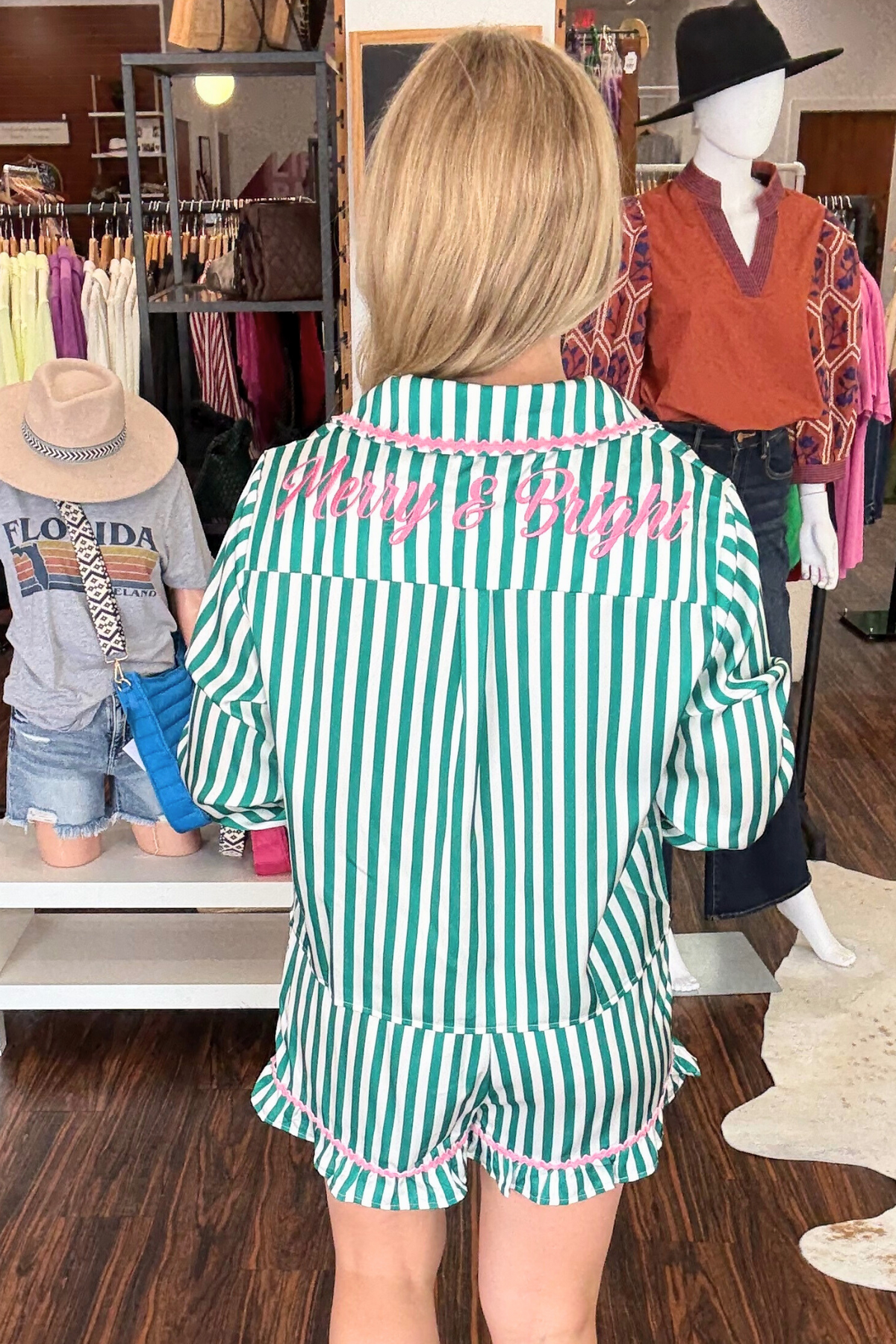 This Kelly Green and Pink Satin Holiday Pajama Set features a long-sleeve, green and white striped top adorned with "Merry and Bright" across the shoulders. It pairs perfectly with matching shorts that showcase a pink tie-waist and delicate pink ric-rac trim for a fresh, festive look. Designed for comfort and style, this set adds a cheerful touch to your holiday loungewear collection. Model is wearing size small.