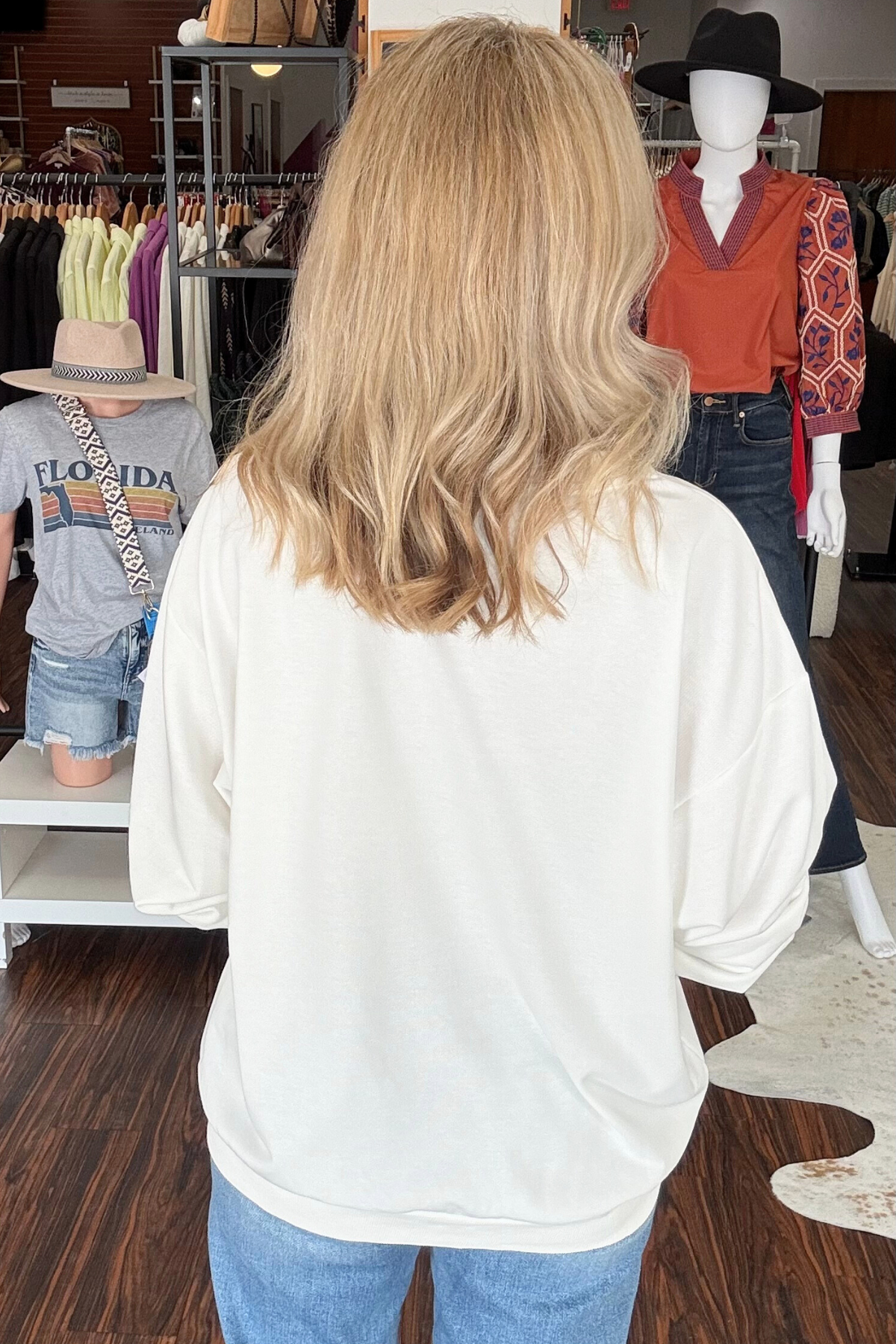 This white oversized sweatshirt features a stylish plaid patchwork Christmas tree accented with a red plaid bow, offering a festive yet modern look. Its relaxed fit ensures comfort while the unique design adds a cozy holiday touch to your casual wardrobe. Perfect for celebrating the season in effortless style. Model is wearing size small.