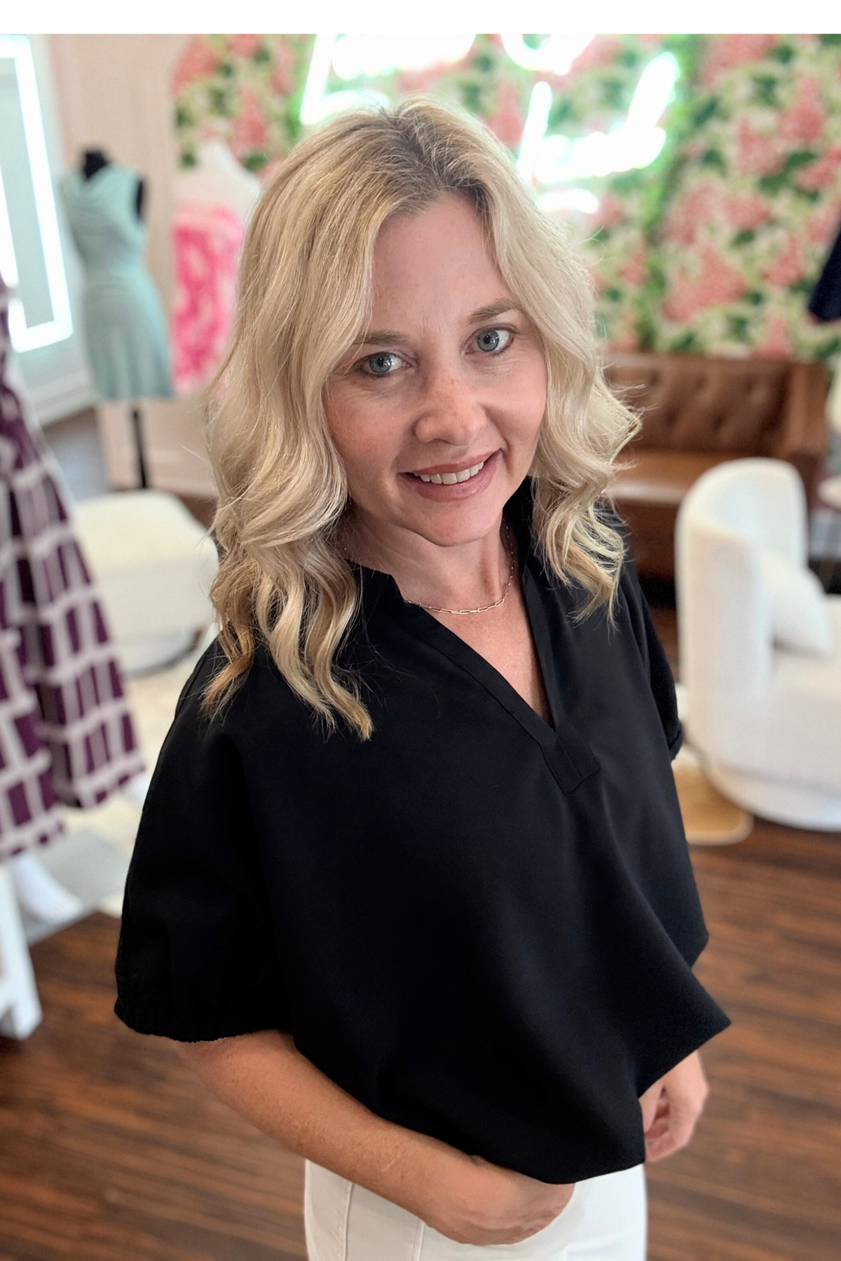 V-neck short sleeve top with elastic around sleeve and split hem on each side