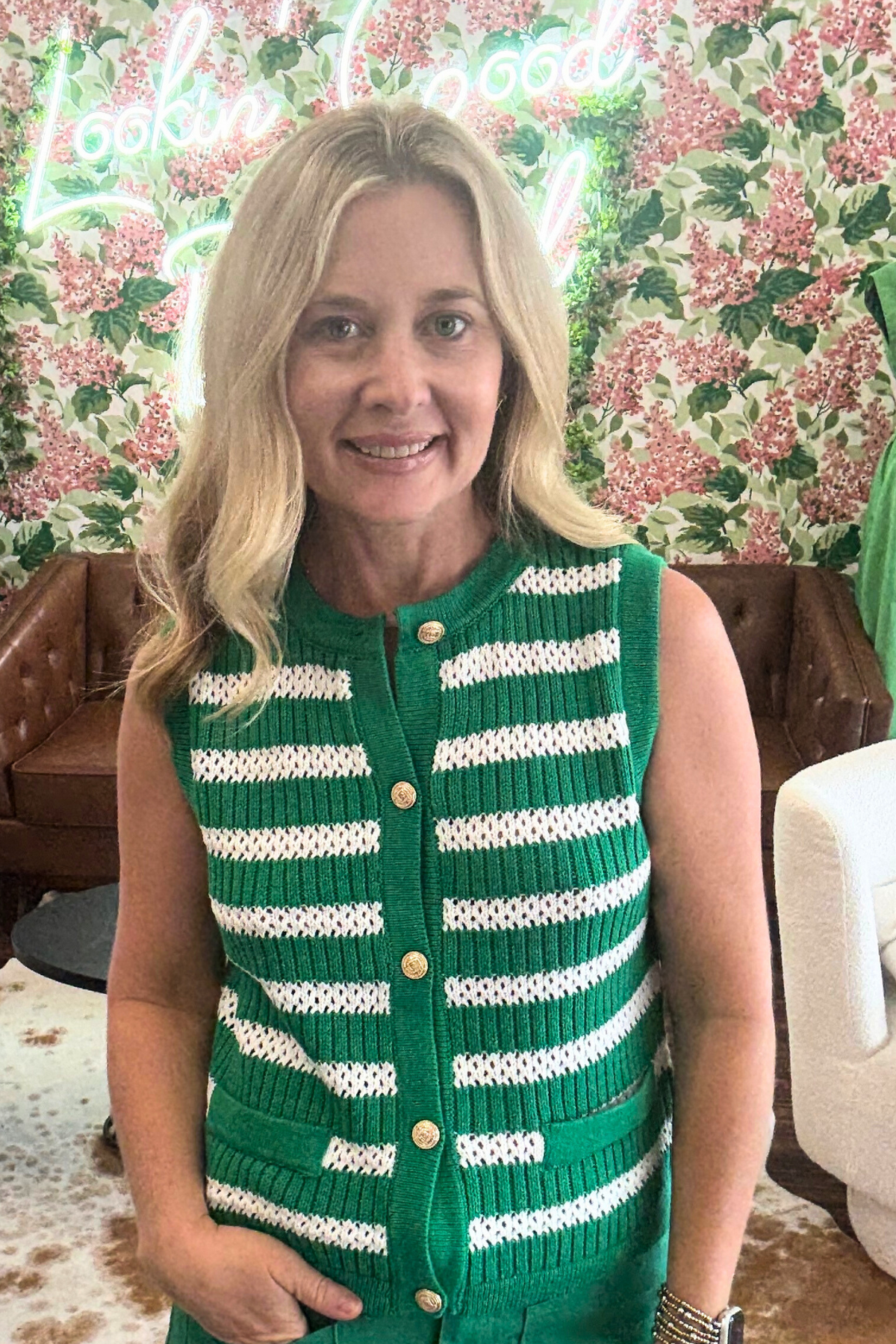 striped sweater vest with gold button detail