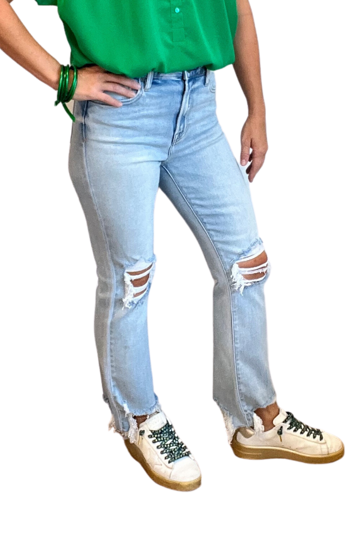 Take your casual style up a notch with these classic Hidden Happi Flares in Medium Wash Denim. Crafted from medium wash blue denim, they feature a cropped flare and frayed hem. Model is wearing size 25.