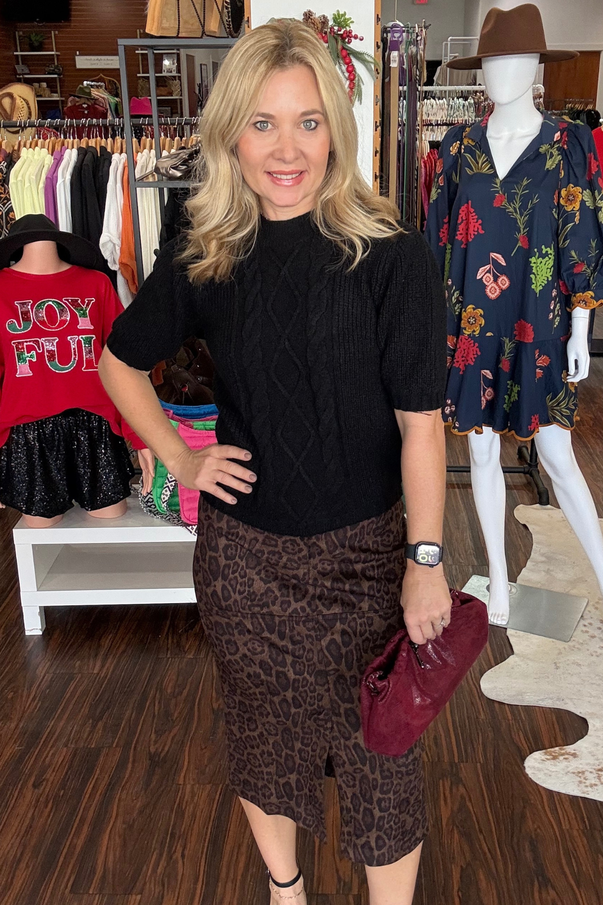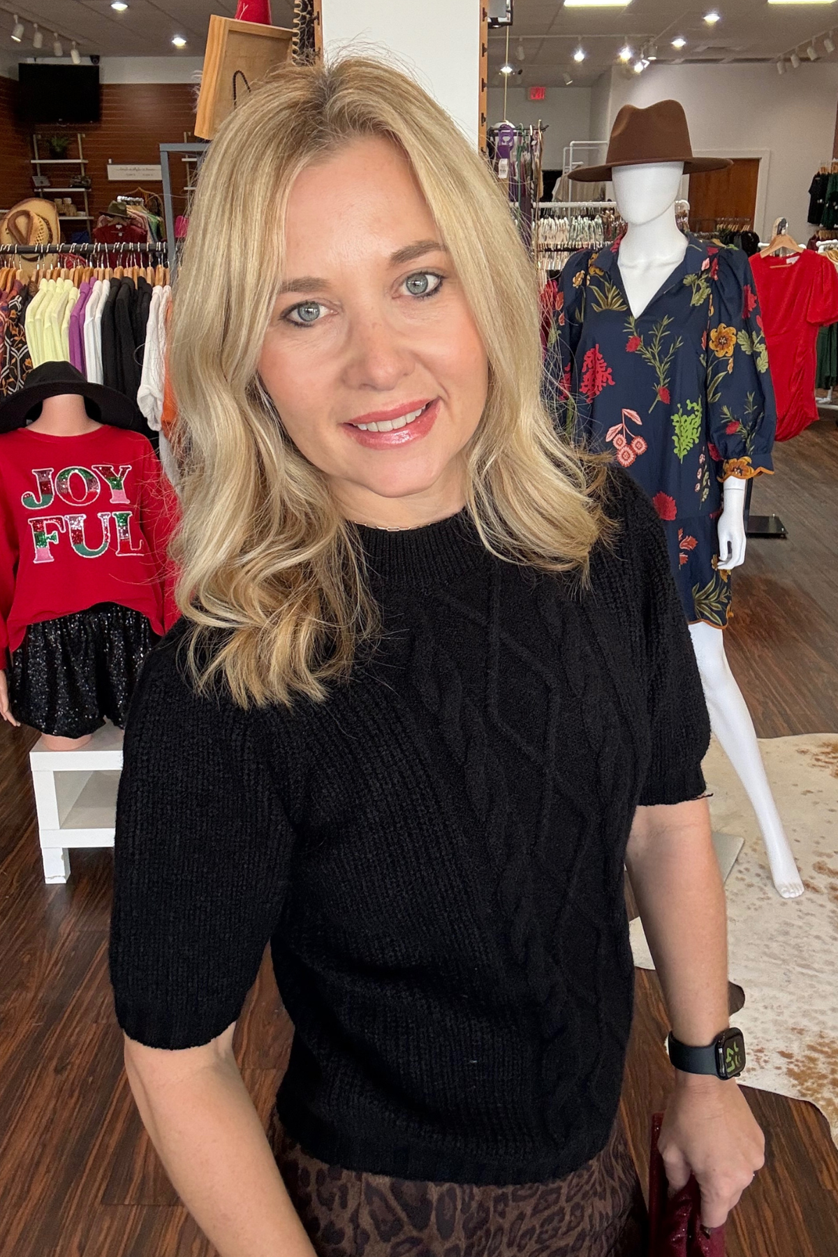 Elevate your everyday wardrobe with this short sleeve cable knit sweater. Crafted with a timeless cable knit texture, it features a relaxed round neckline perfect for layering or wearing solo. The shorter sleeves offer a contemporary silhouette that works seamlessly from season to season. Versatile enough for casual weekends or dressed up for the office, this piece brings texture and sophistication to any outfit. Model is wearing size small.