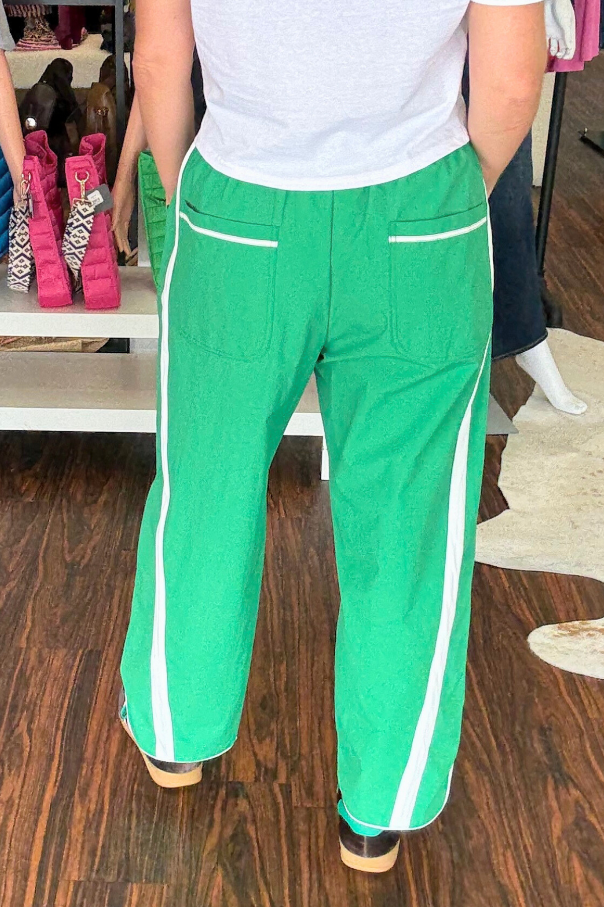 These Windbreaker Pants feature a modern cropped fit crafted from lightweight material for easy movement and all-day comfort. A bold contrast stripe runs down each leg, adding a sharp, stylish edge. Unique notch cutouts at each ankle enhance the contemporary design, making these pants perfect for an active, fashion-forward look. 25 inch inseam. Model is wearing size small.