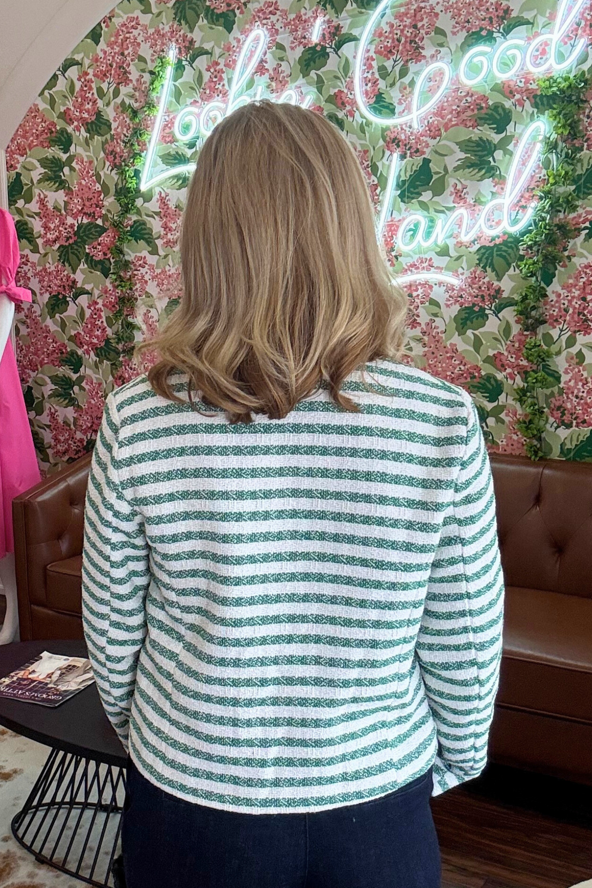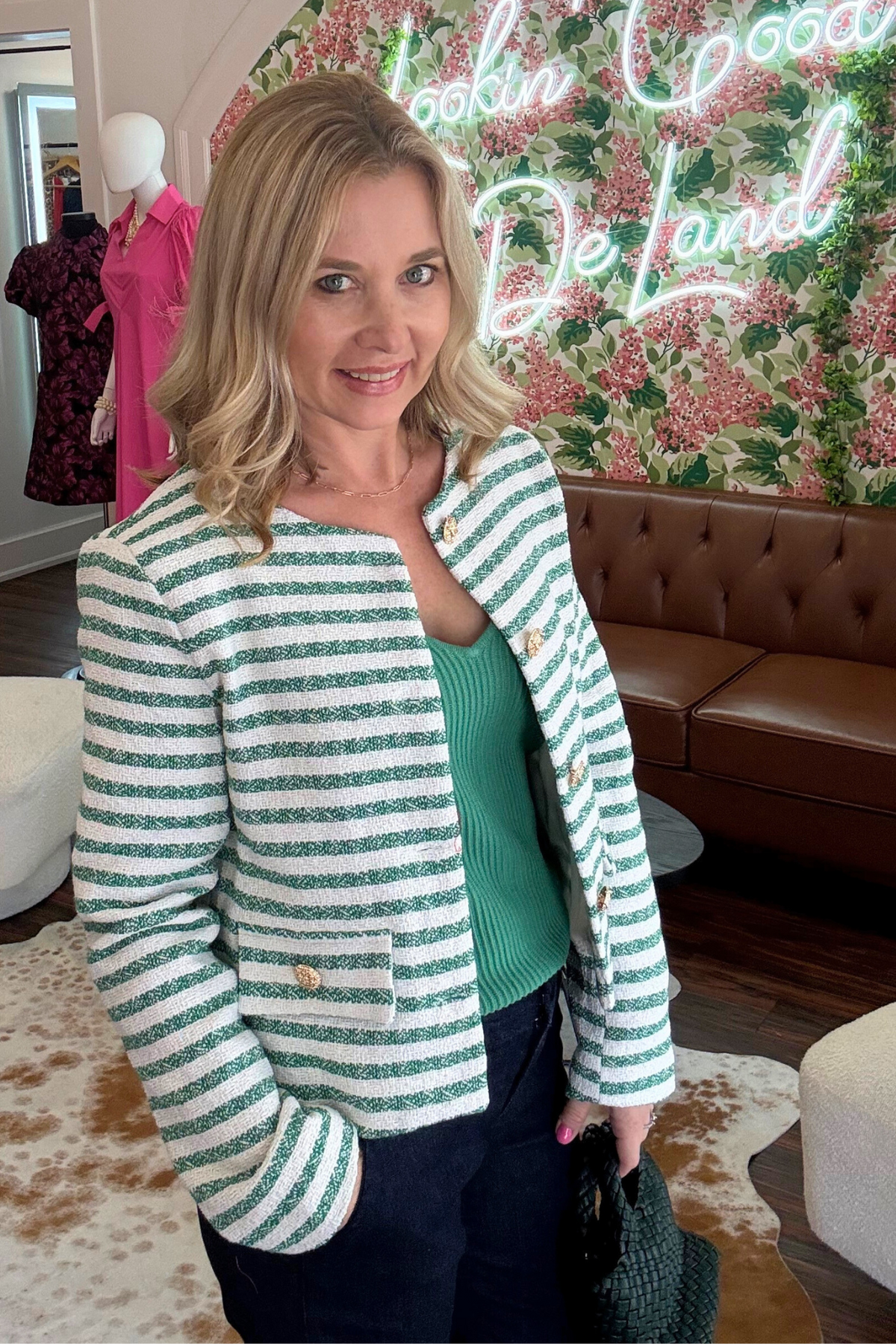 Expertly crafted, this tweed jacket features a stylish green and white striped pattern accented with a gold front closure button. Its lightweight and non-sheer construction makes it perfect for any occasion. Stay stylish and comfortable with this lined, woven jacket. 100% Polyester. Model is wearing size small.