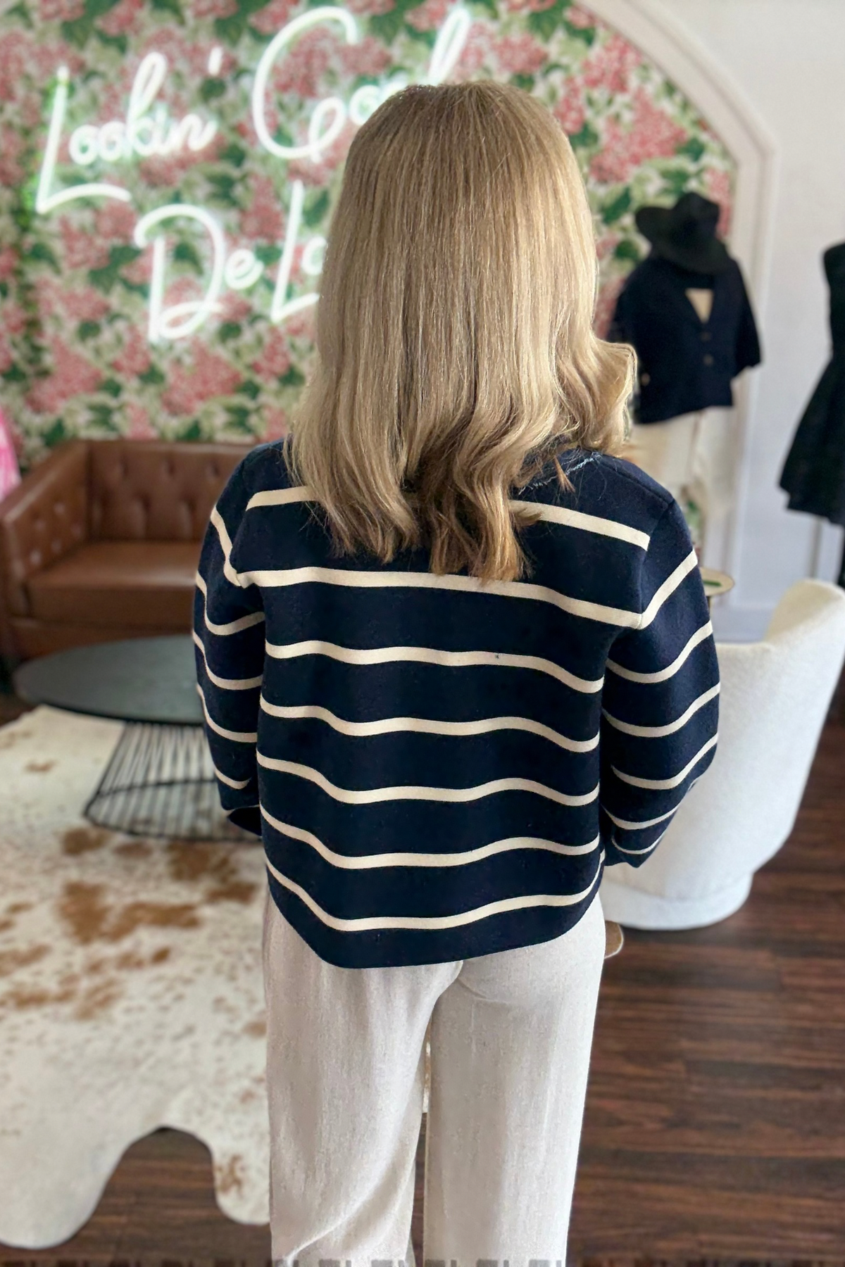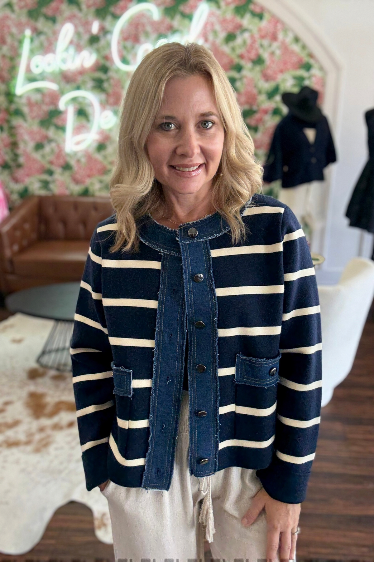 This striped knit jacket combines modern style with comfort, featuring a denim contrast neck band and front button closure for a sleek look. Midweight and non-sheer, it offers practical patch pockets and an unlined design, making it perfect for layering in any season. Model is wearing size small. 50% Viscose, 30% Polyester, 20% Nylon.