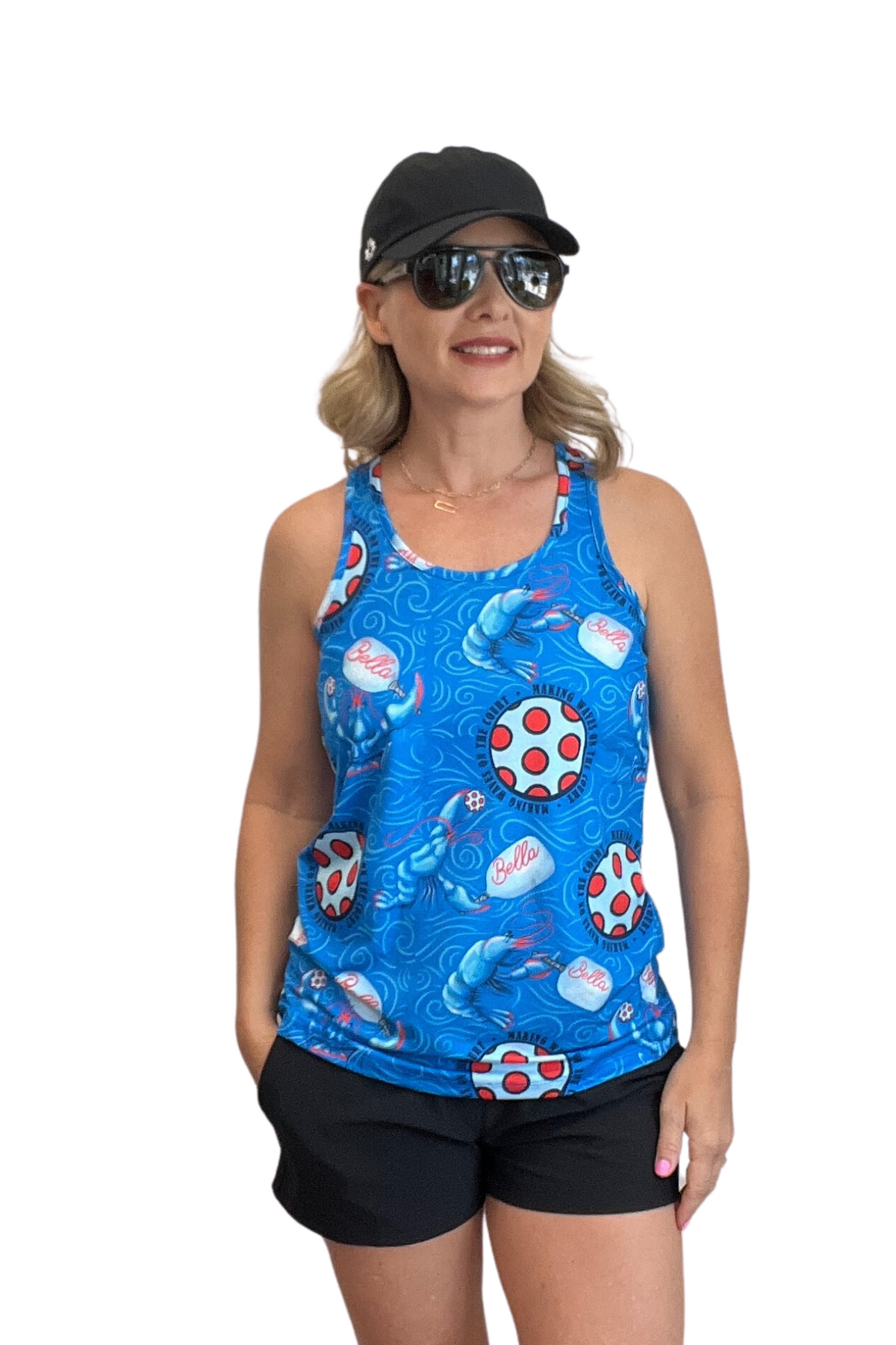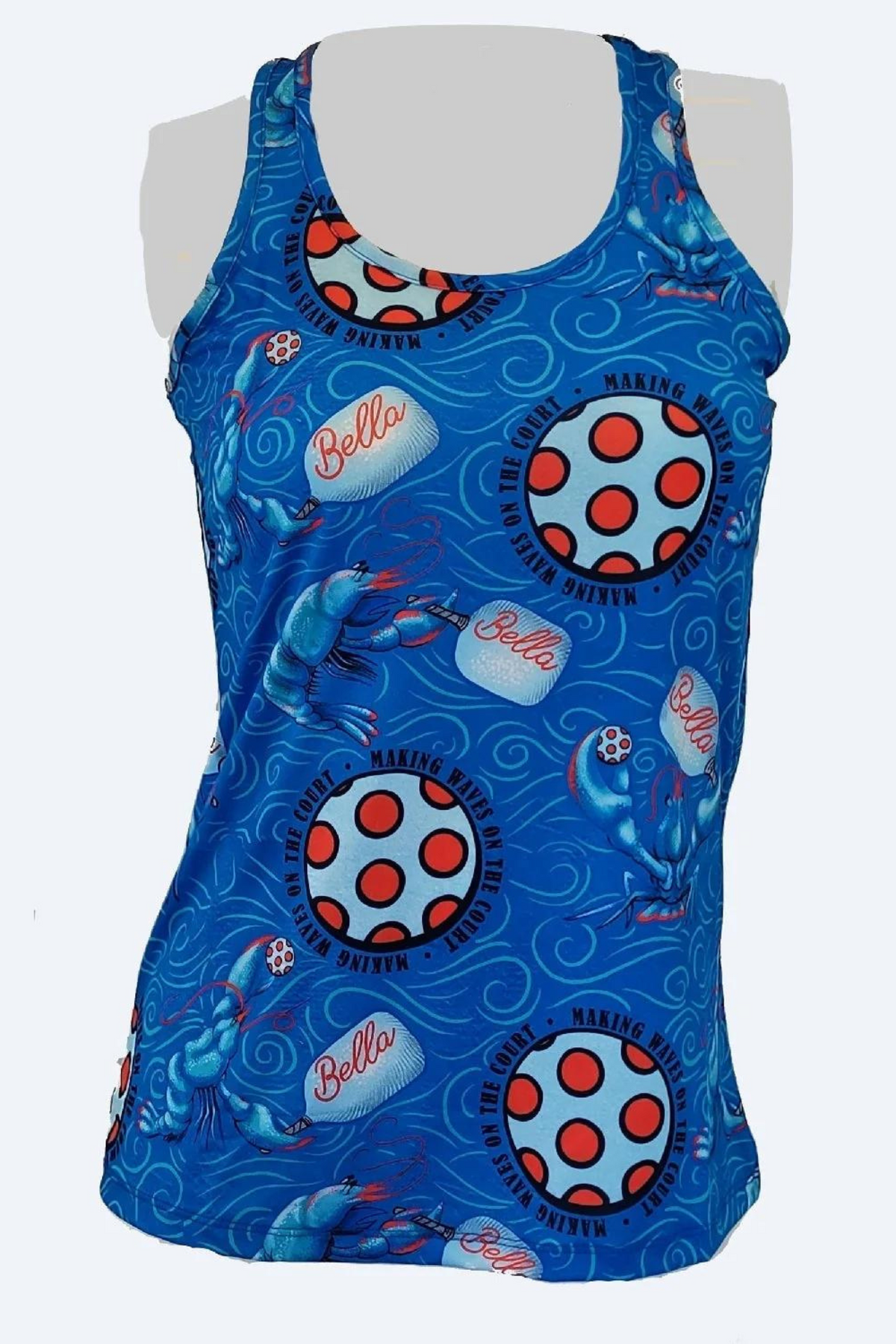 This Lobster Pickleball Racerback Tank Top is made of an ultra-stretch fabric that provides a comfortable fit. Its advanced moisture-wicking and anti-odor technology keep you cool and dry, while it also offers 50+ UV protection. This top is available in four sizes and is made of 86% polyester / 14% Nylon. The perfect combination of comfort and style.