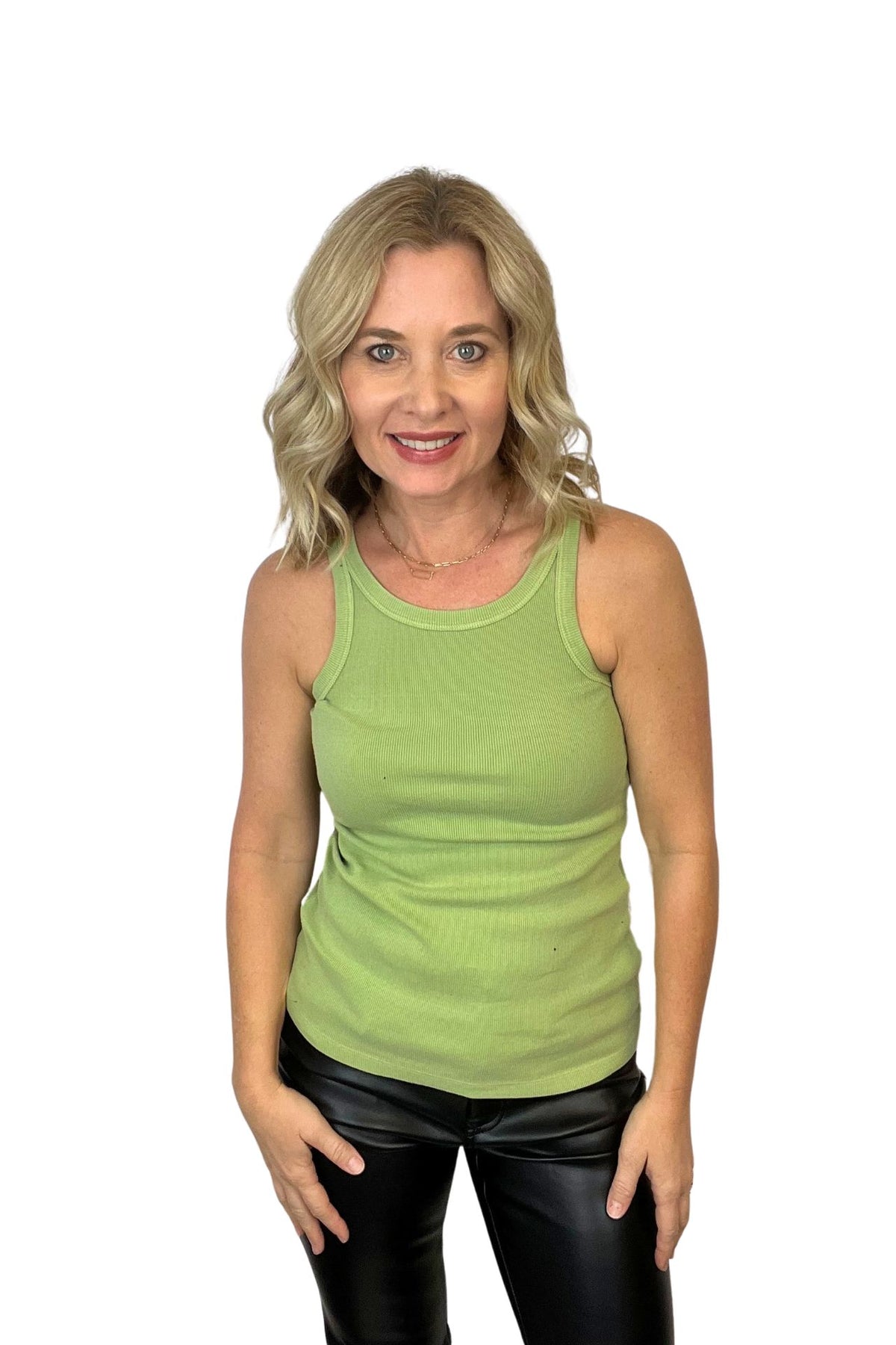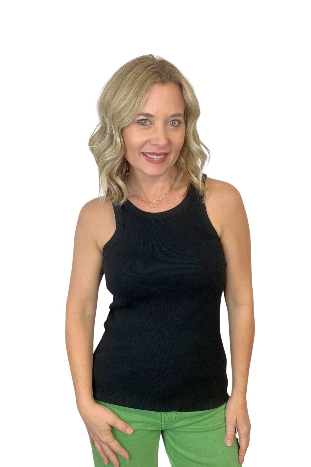 Stay cool and comfortable in the Tamia Racer Back Tank. Featuring a crew neck, ribbed neck and armhole band, and a fitted design in a solid color knit. The perfect blend of style and functionality for wearing alone or as a layering piece. Model is wearing size XS.