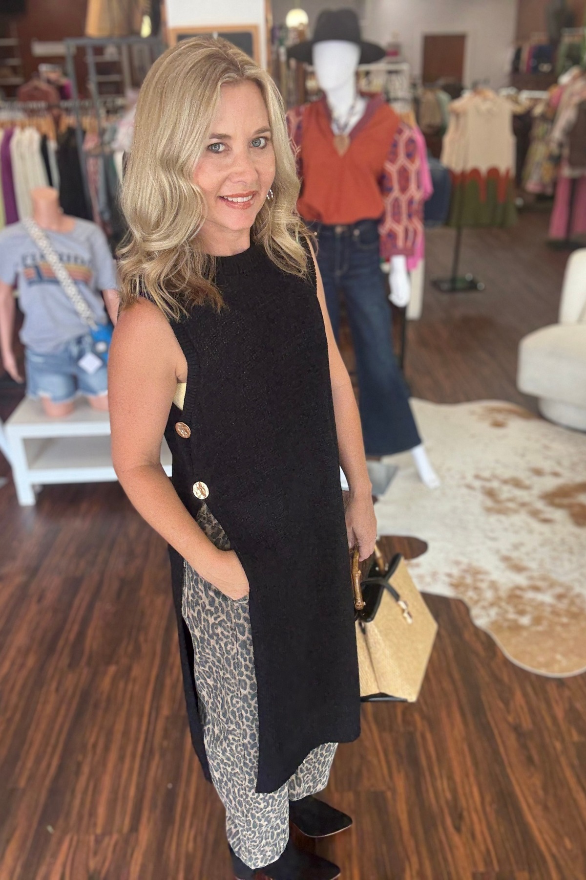 This sleeveless pullover long sweater vest features two gold buttons on each side, adding a chic, modern touch to your outfit. Crafted from lightweight material, it provides comfortable layering without bulk, perfect for transitioning through seasons with style and ease.