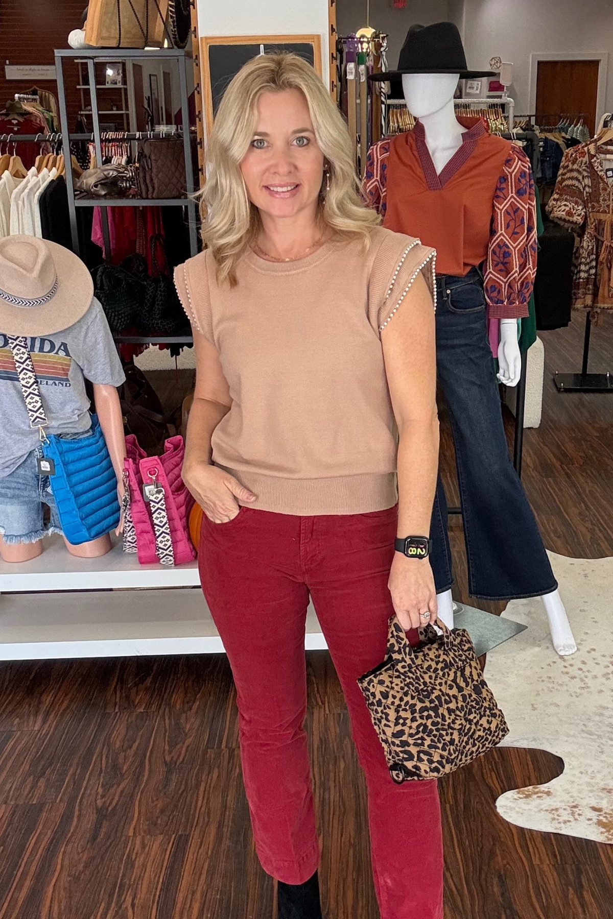 This tan sleeveless sweater top features a sleek, modern design with delicate pearl trim accenting the sleeves. Its lightweight knit fabric offers comfortable layering, perfect for a polished yet effortless look. Ideal for both casual and dressier occasions, this piece adds subtle elegance to your wardrobe. Model is wearing size small.